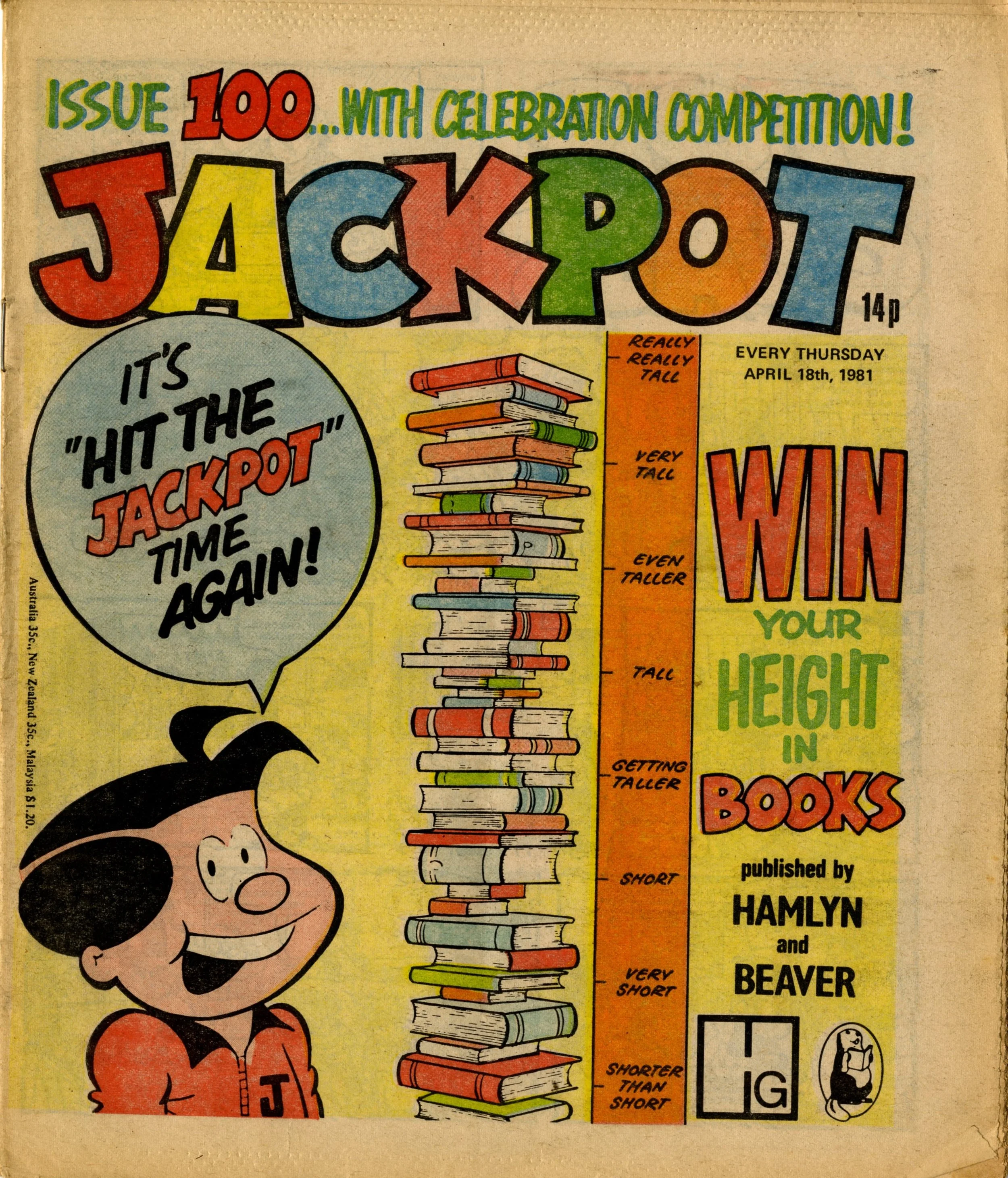The one hundredth issue of Jackpot. Jack Pott, a character who appeared first in Cor!! comic, was most regularly drawn by Jim Crocker, who I think is the artist here.