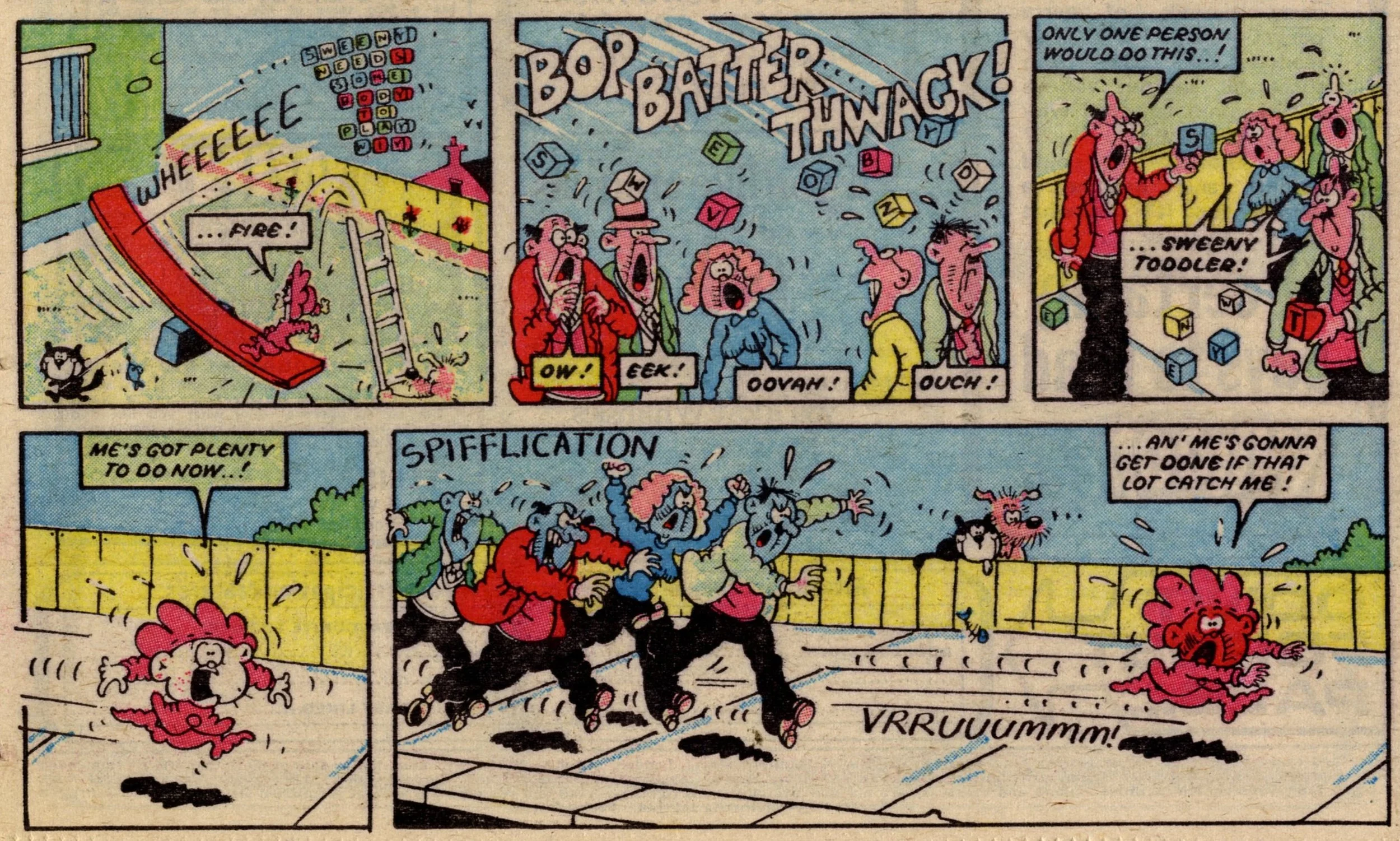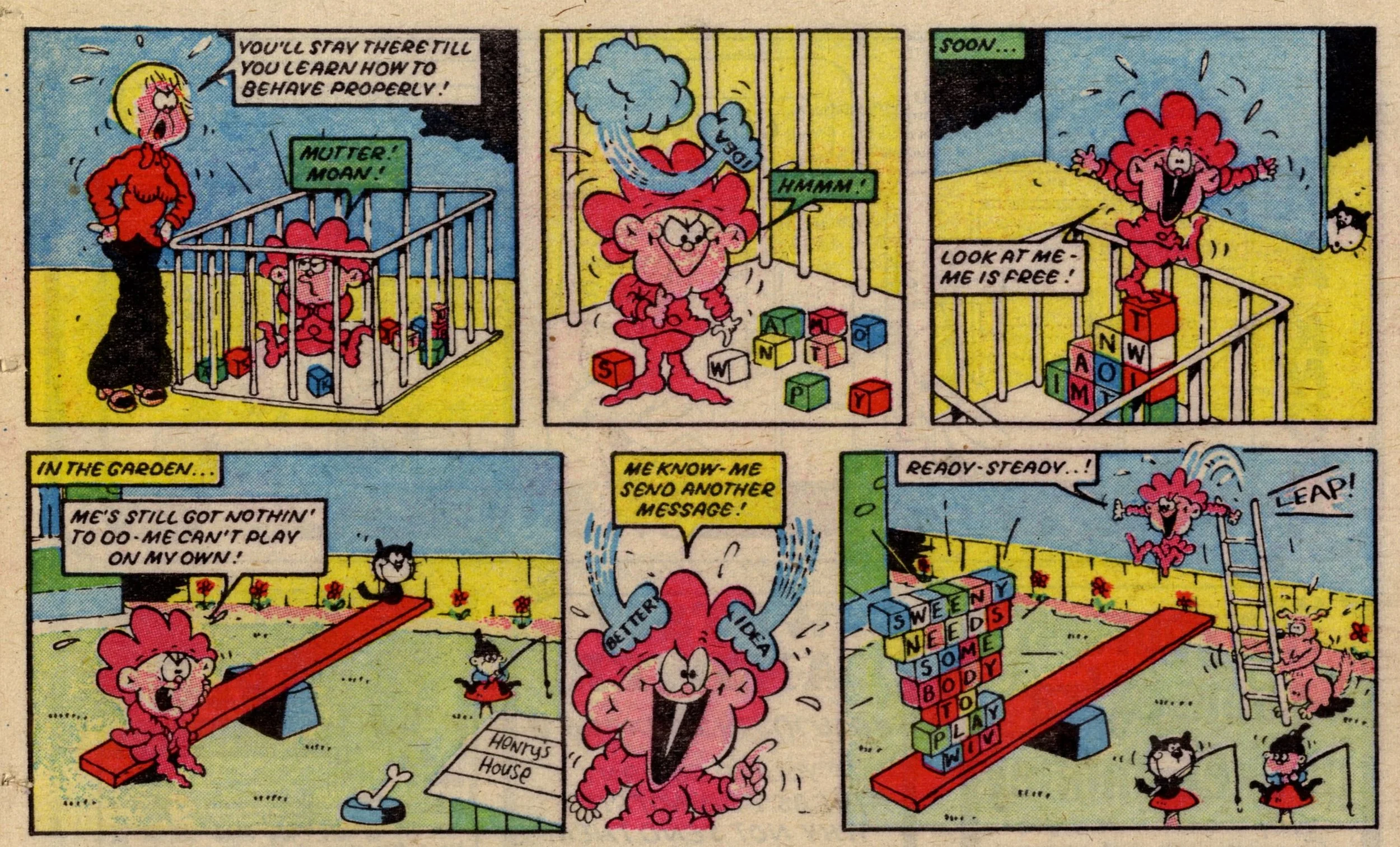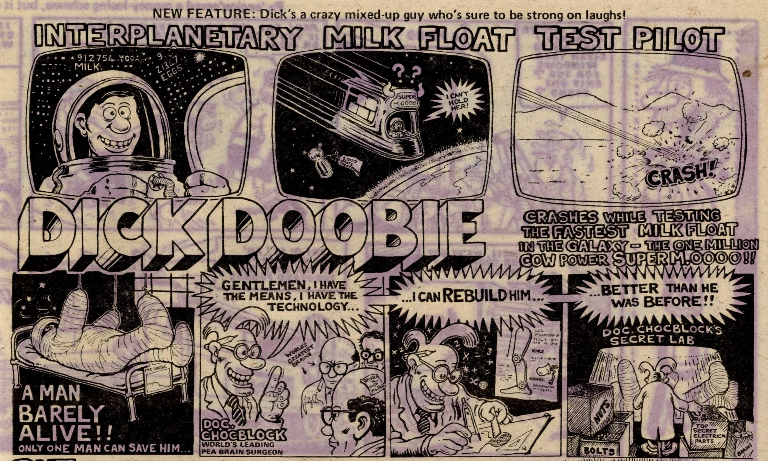 One of two new strips to begin in this week's (39 years ago) issue of Whoopee! was the remarkable Dick Doobie The Back to Front Man, created by Steve Bell, who has since become one of the world's greatest subversive political cartoonists. His outstanding If ... has run in the Guardian since 1981, and you can browse much more of his work on his Belltoons website.