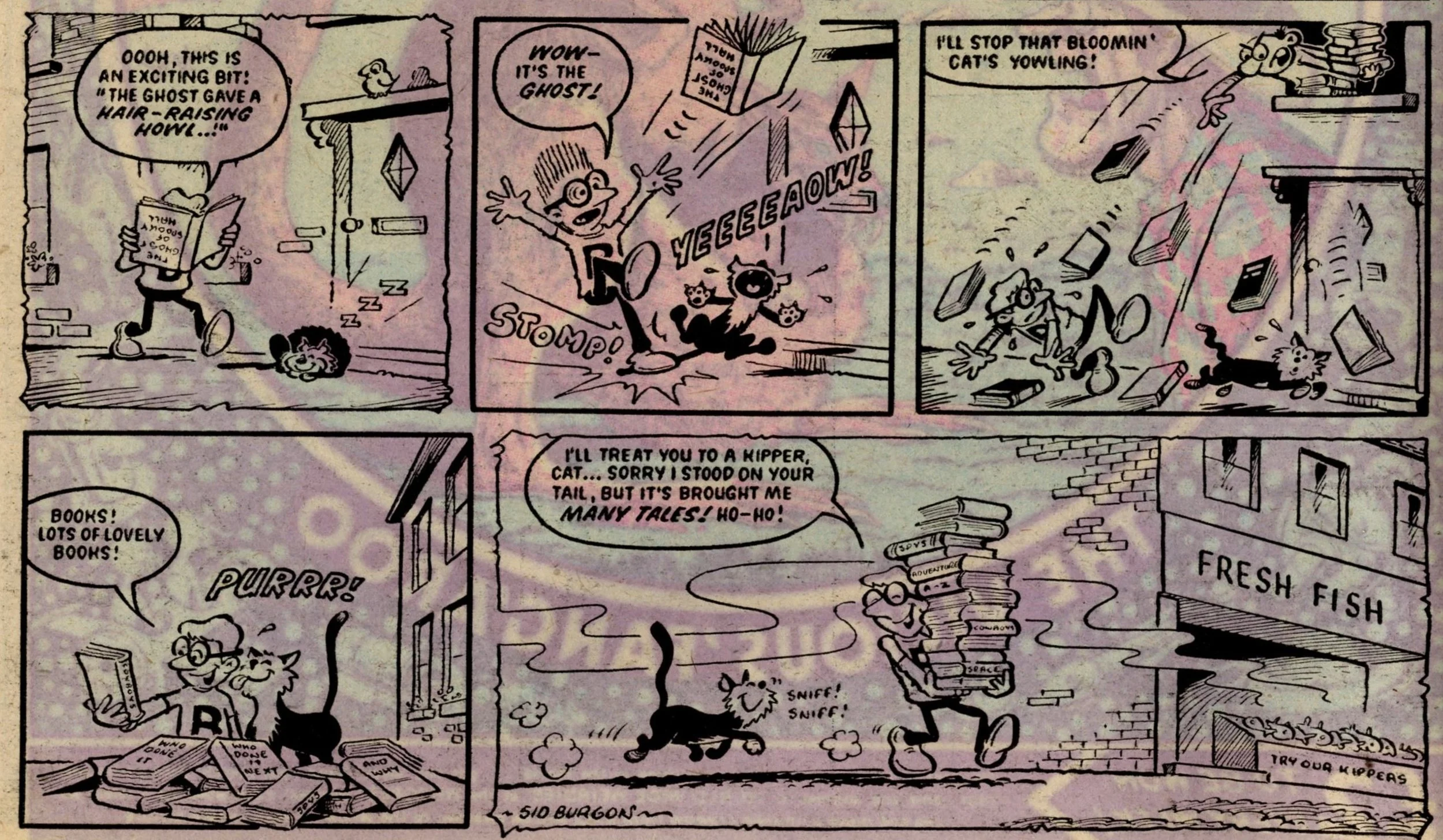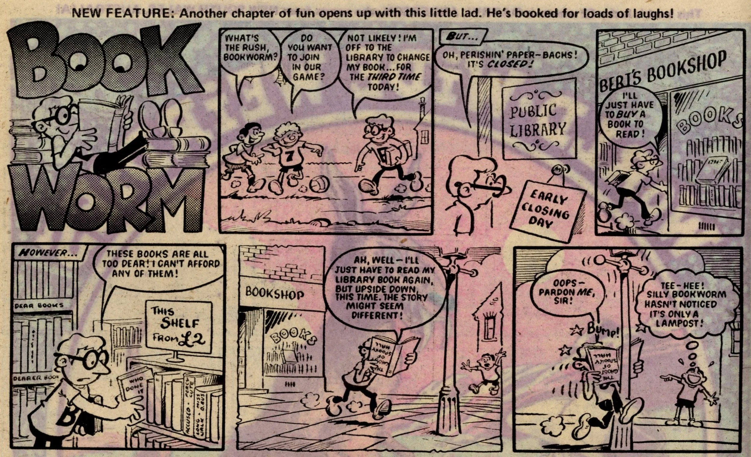 The other new story to begin in this issue of Whoopee! was Book Worm, a rather more traditional strip than Doobie although much longer-lasting (it survived Whoopee!'s merge into Whizzer and Chips eight years later), and initially drawn by another of my all-time favourite artists, Sid Burgon.