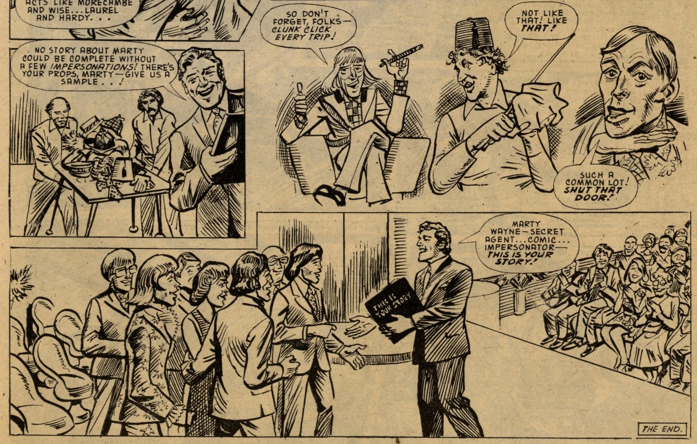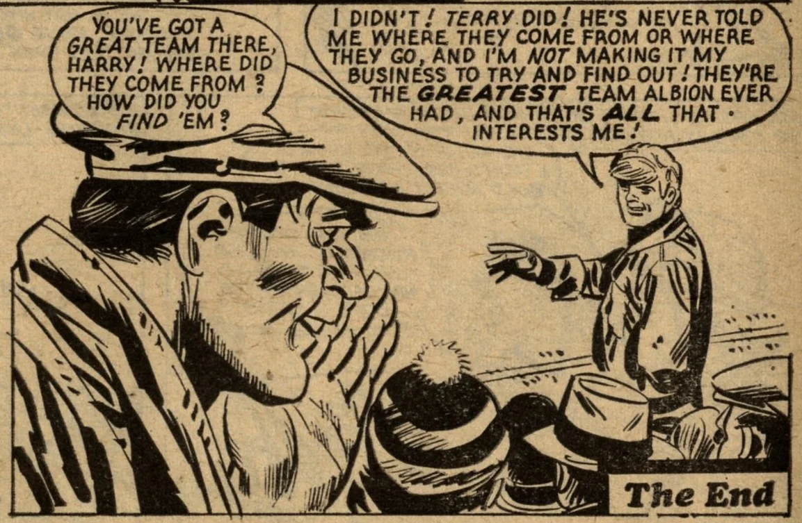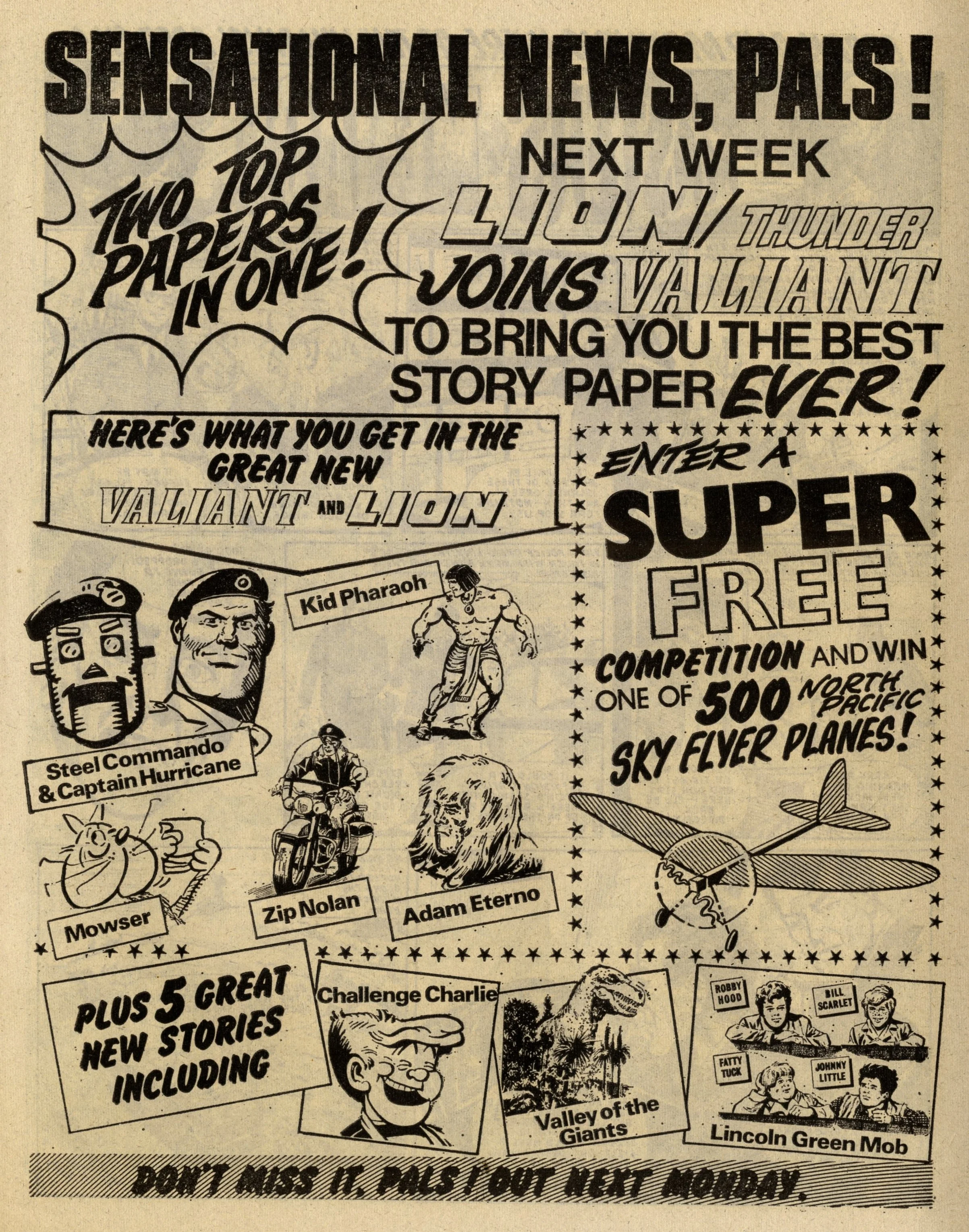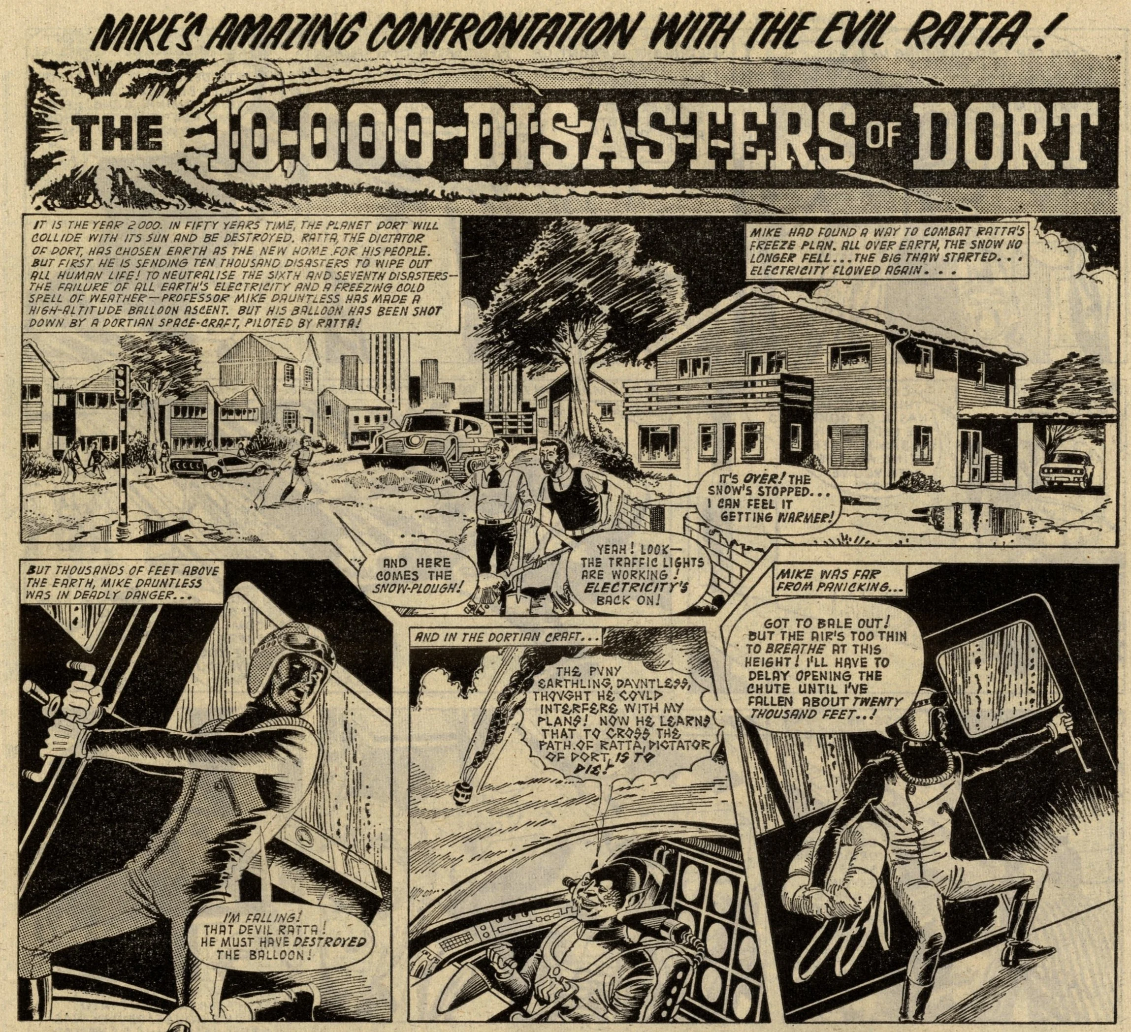 Only a few Lion strips made the cut. Adam Eterno, Zip Nolan and Reg Parlett’s excellent humour strip Mowser all appeared in next week’s Valiant and Lion, while the tin-pot trooper Steel Commando was teamed up with Captain Hurricane. So this is an issue full of endings, bringing to a close no fewer than eight serials: dimension-bending sorcerer Spellbinder, super-criminal drama Masters of Menace, bequiffed TV star Marty Wayne, droid pal Robot Archie (who had appeared in Lion’s first issue, twenty-two years previously), sci-f adventure Sark the Sleeper, bonkers football story The Team Terry Kept in a Box, even more bonkers ghostly athletes story The Last of the Harkers and future thriller The 10,000 Disasters of Dort.