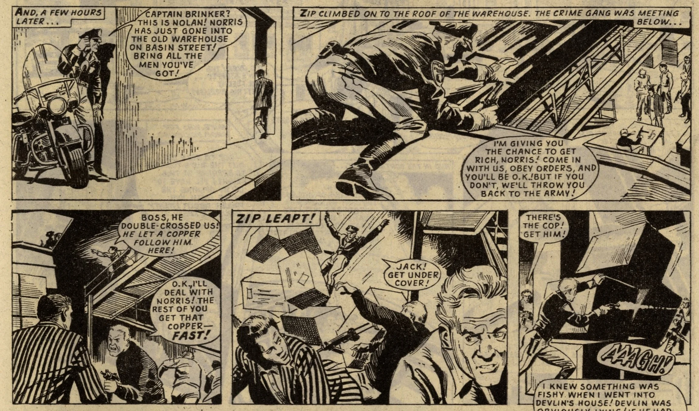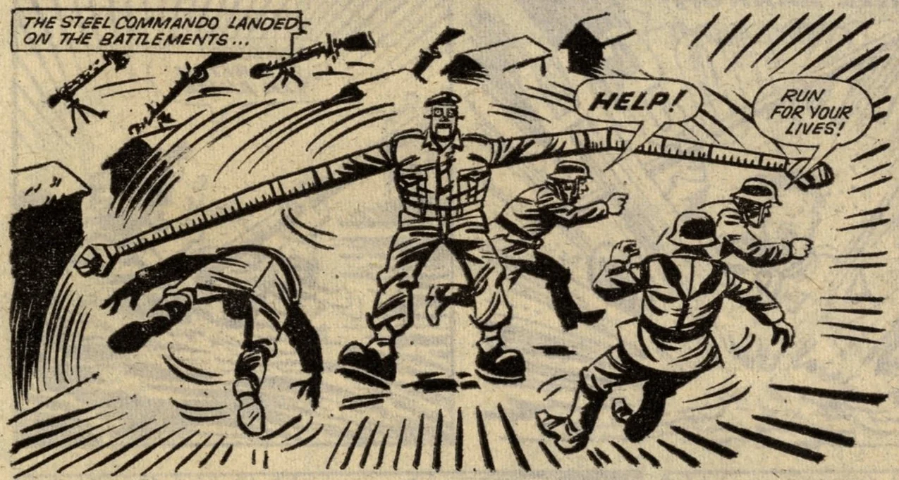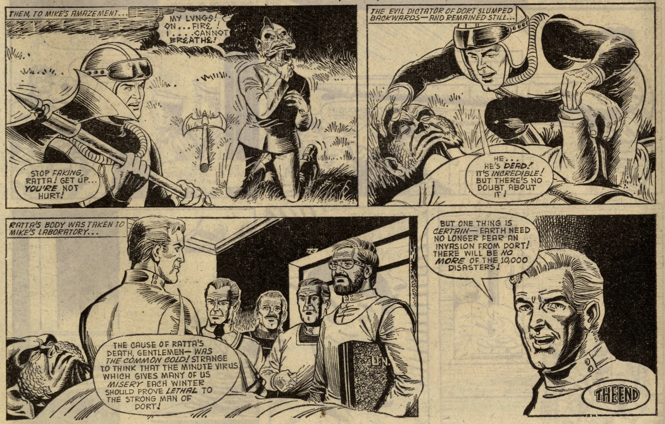 Only a few Lion strips made the cut. Adam Eterno, Zip Nolan and Reg Parlett’s excellent humour strip Mowser all appeared in next week’s Valiant and Lion, while the tin-pot trooper Steel Commando was teamed up with Captain Hurricane. So this is an issue full of endings, bringing to a close no fewer than eight serials: dimension-bending sorcerer Spellbinder, super-criminal drama Masters of Menace, bequiffed TV star Marty Wayne, droid pal Robot Archie (who had appeared in Lion’s first issue, twenty-two years previously), sci-f adventure Sark the Sleeper, bonkers football story The Team Terry Kept in a Box, even more bonkers ghostly athletes story The Last of the Harkers and future thriller The 10,000 Disasters of Dort.