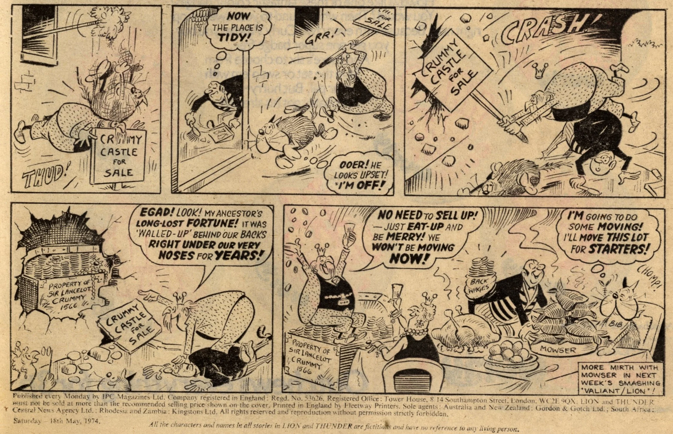With over eleven hundred issues, running from February 1952 to this final edition in May 1974, Lion was one of the big cats of British comics, so reading through these pages is a sad experience – even though the content is, on the whole, a bit tired for its time. Lion was about to be merged into Valiant – another major title from the 1960s, whch would in turn be swallowed up by Battle a couple of years later.