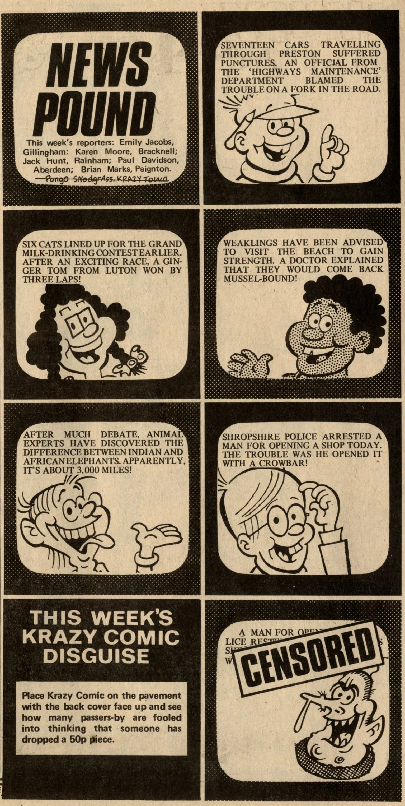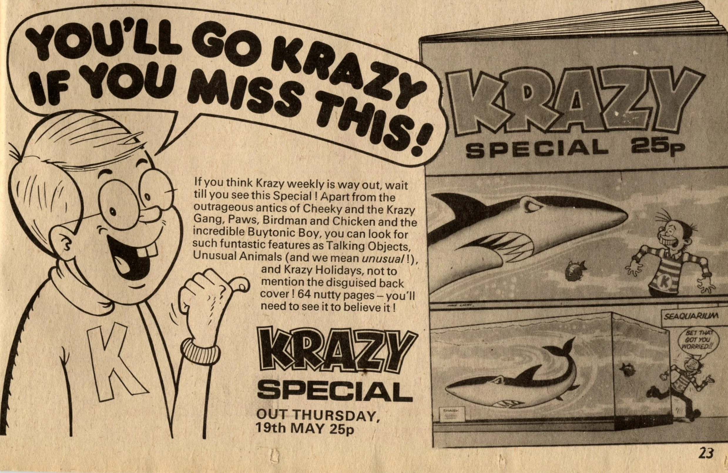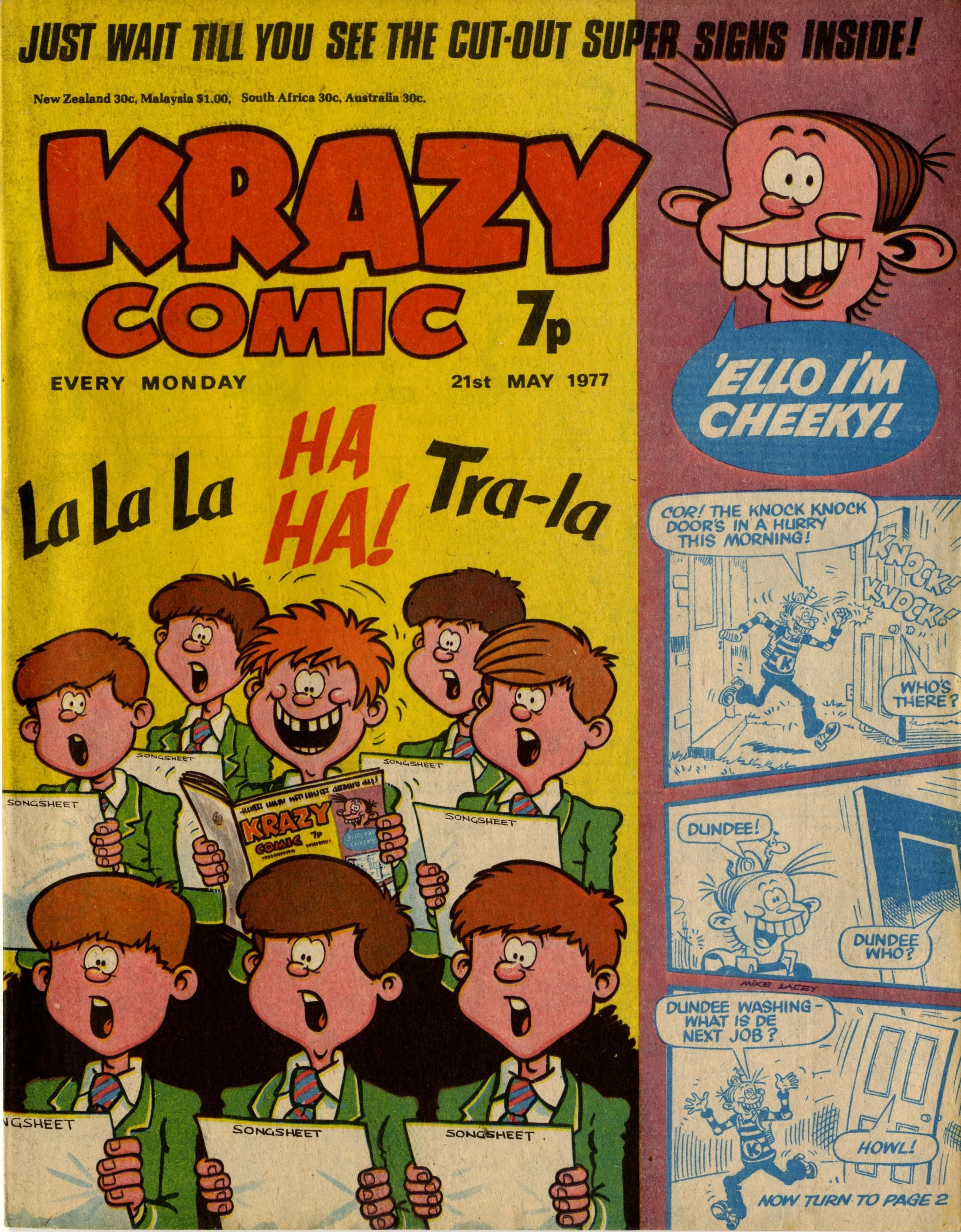 In yesterday’s post I implied that Krazy’s incorporation into Whizzer and Chips in 1978 was something of a wonky-shaped peg in a conventionally-shaped hole, and here’s a reminder of what a dynamic, freeform, irreverent, bonkers delight it had been, from the previous year.