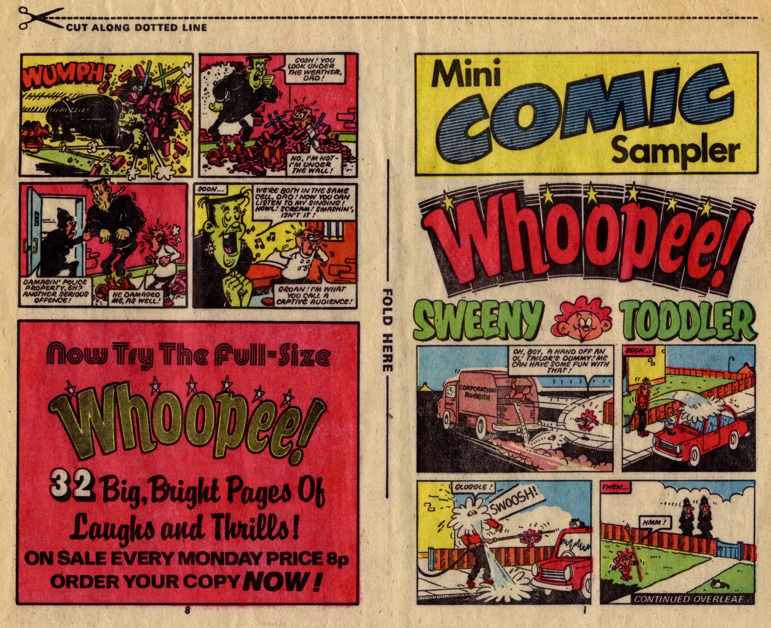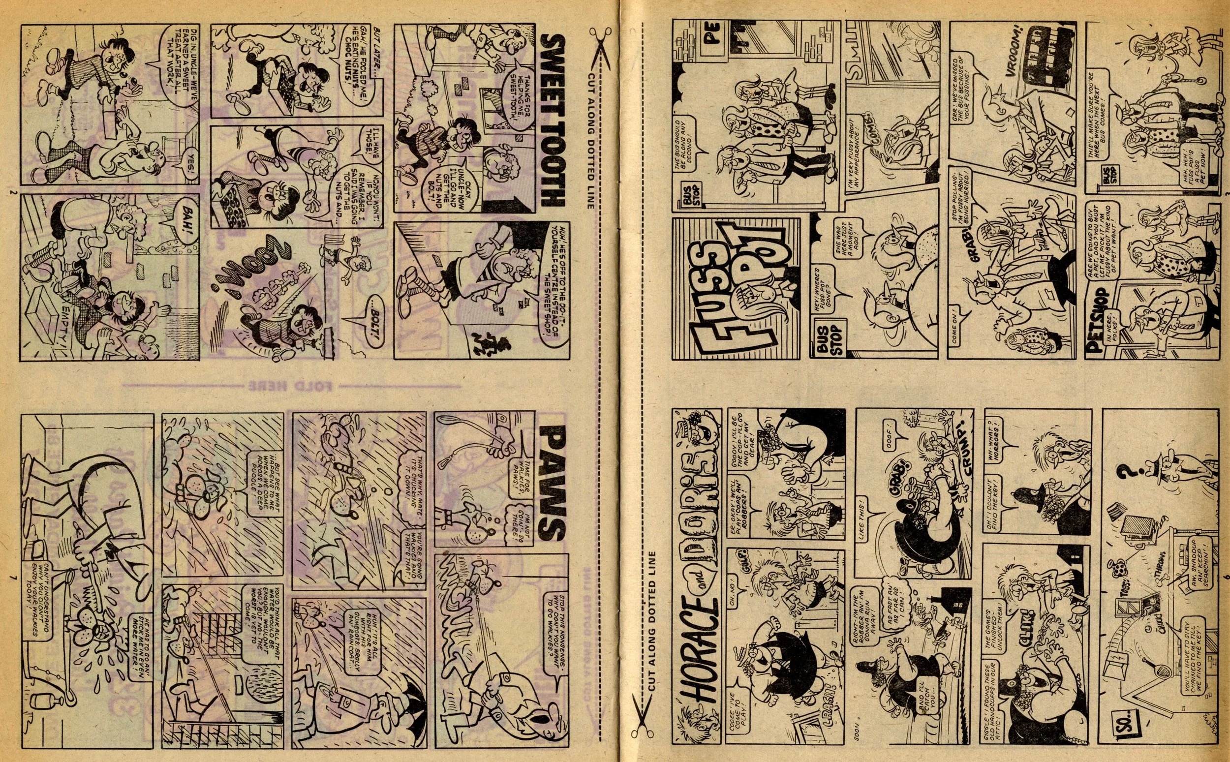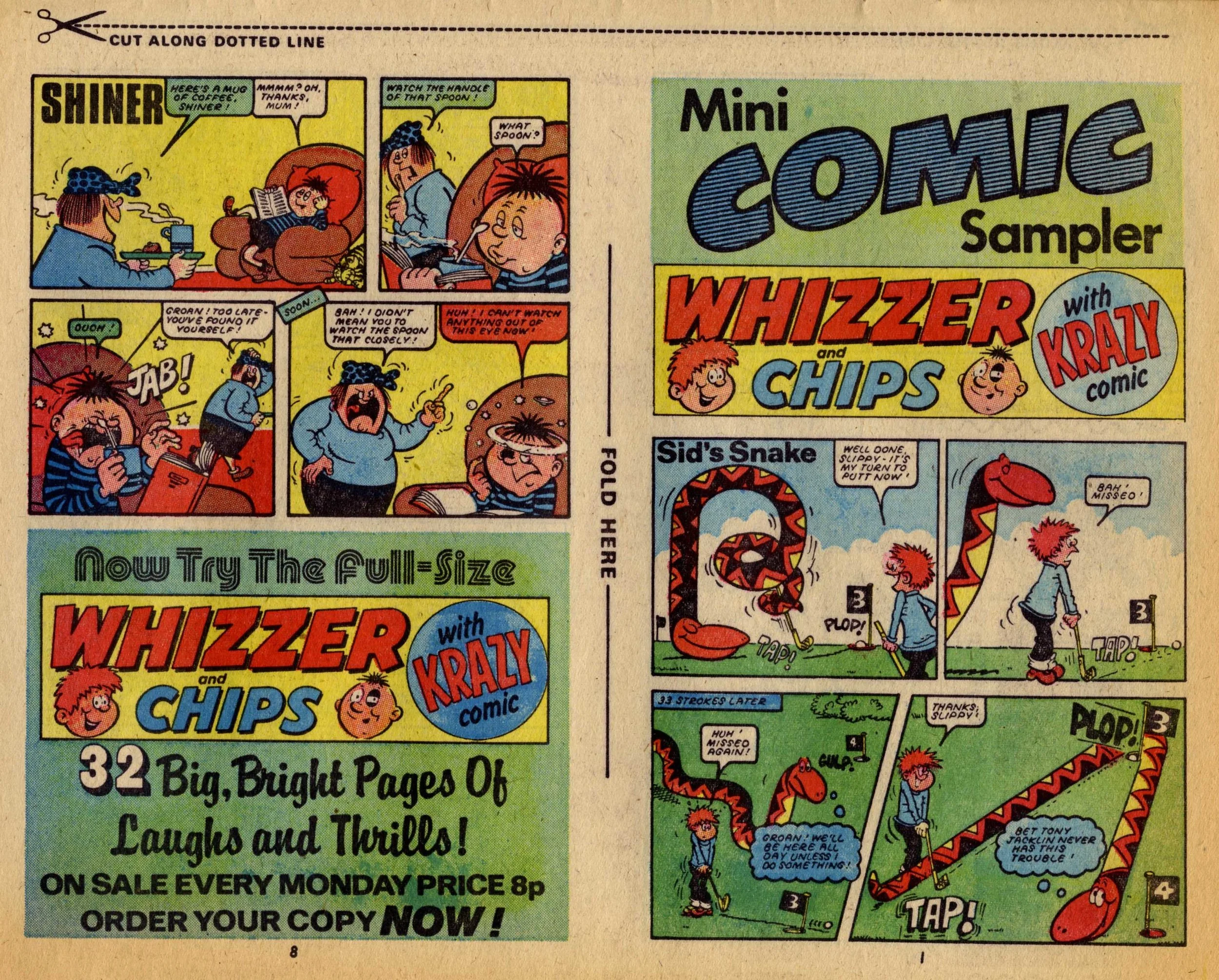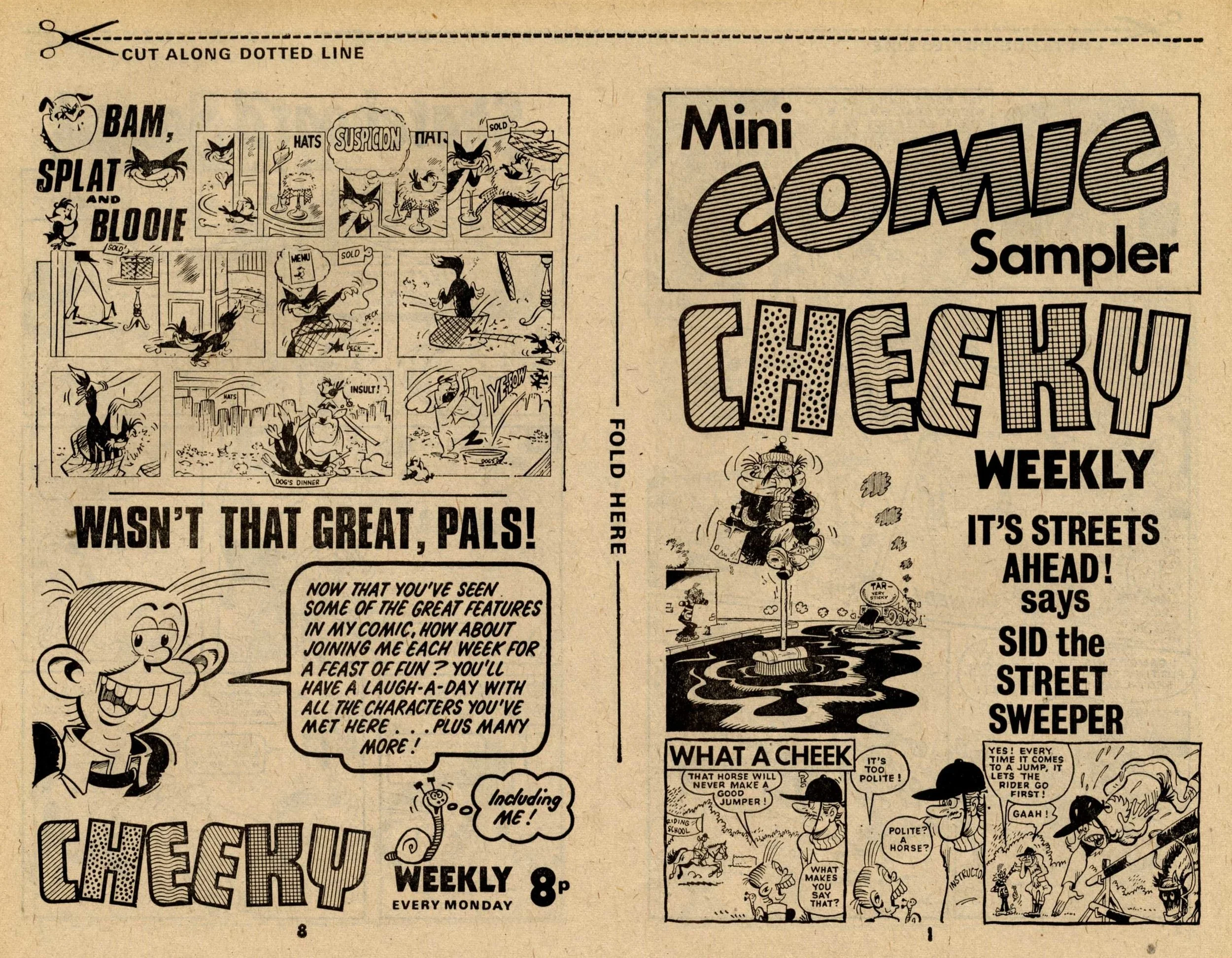 Also, promotions such as this offered a rare opportunity to catch up with who was who in the companion comics. I was a reader of Whizzer and Chips and Cheeky at this point, but characters such as Sweeny Toddler, The Bumpkin Billionaires, Buster and Ivor Lott and Tony Broke were familiar to me too because of weeks such as these. It appears to have been a great way for IPC to advertise its range (including the Disney-licensed Mickey Mouse comic, of which sadly I don’t have a copy to share), although I wonder how it worked out for the creators. I wouldn’t be surprised if they received only half their usual page rate for the creation of each mini-story here, although I suspect it was equally if not more challenging to tell a complete funny tale in half the number of panels.