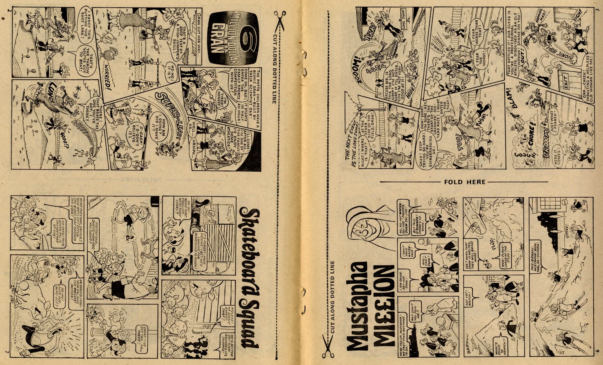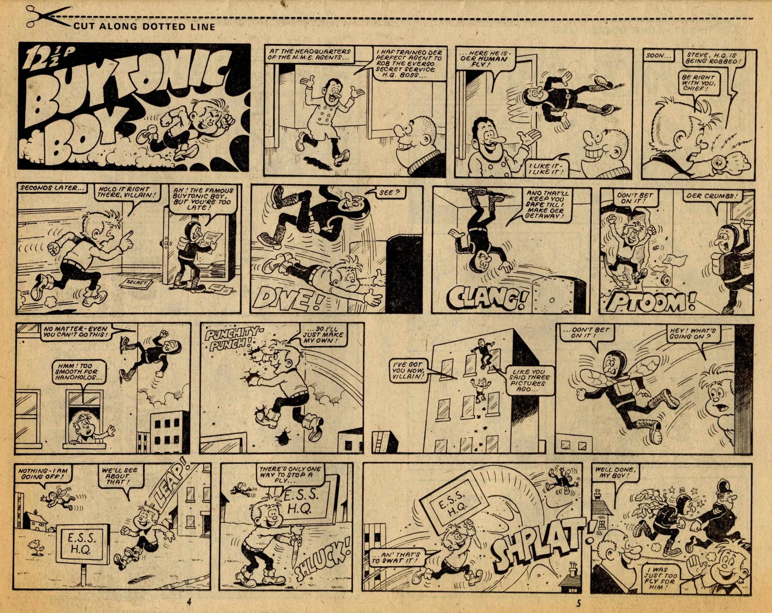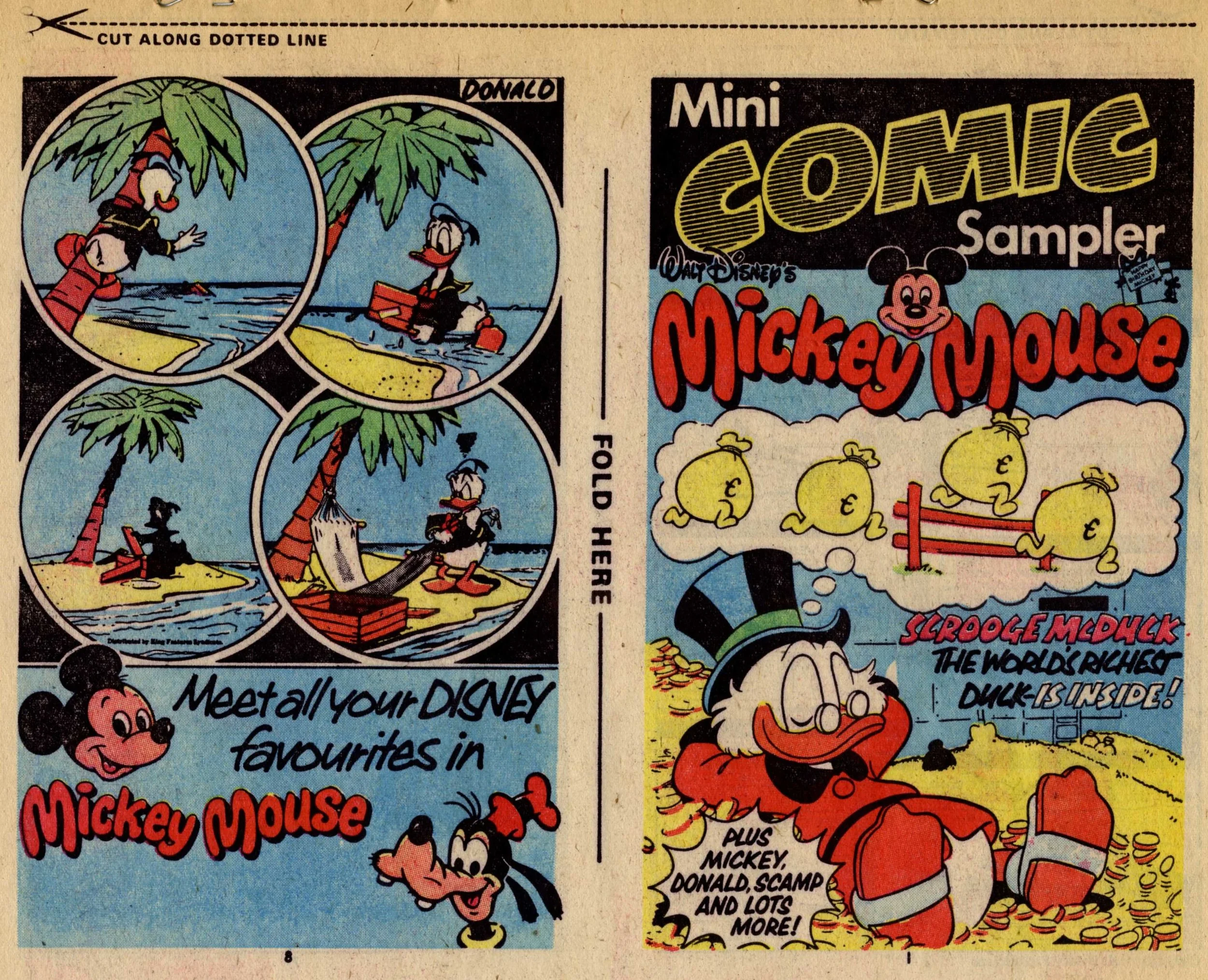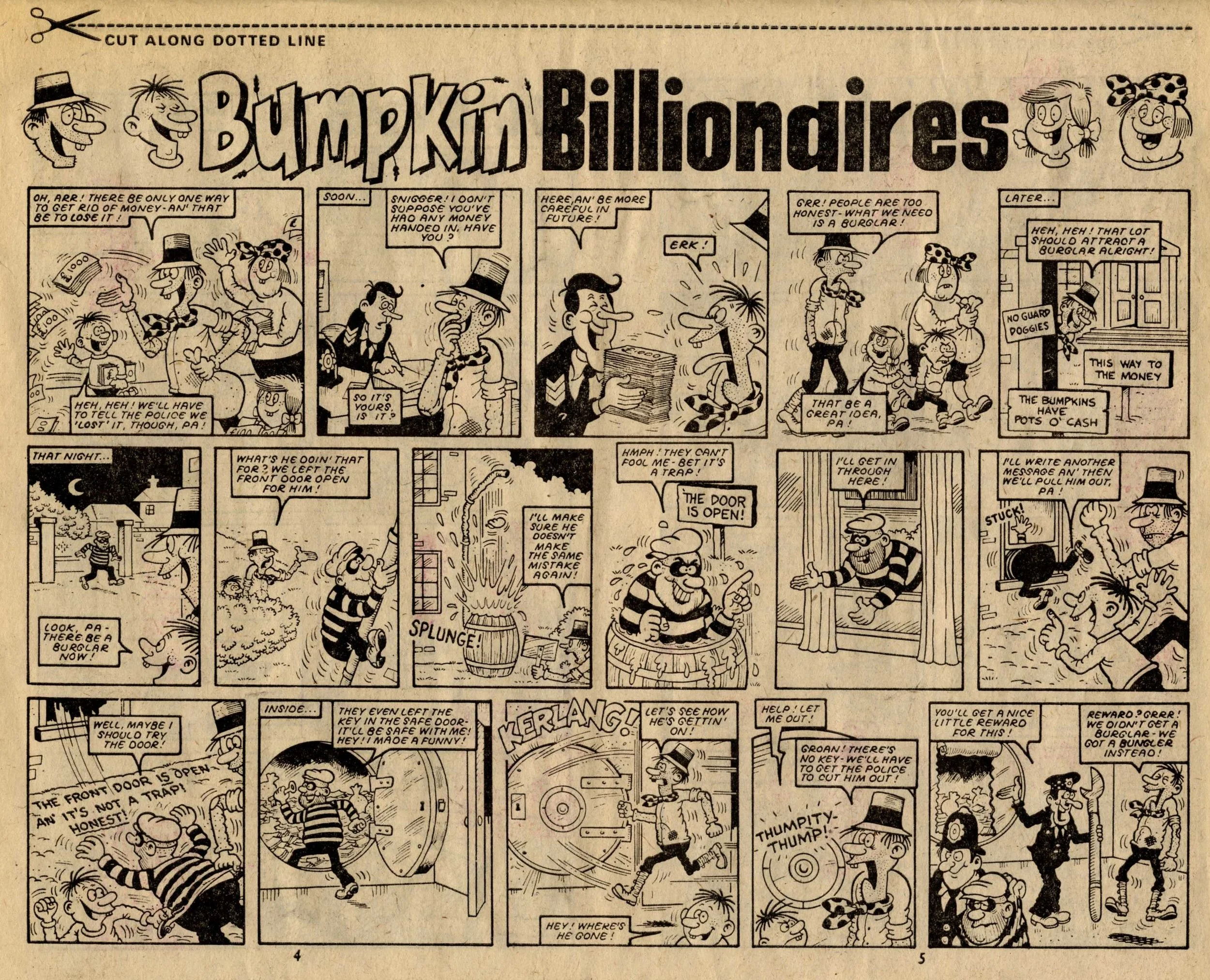 Also, promotions such as this offered a rare opportunity to catch up with who was who in the companion comics. I was a reader of Whizzer and Chips and Cheeky at this point, but characters such as Sweeny Toddler, The Bumpkin Billionaires, Buster and Ivor Lott and Tony Broke were familiar to me too because of weeks such as these. It appears to have been a great way for IPC to advertise its range (including the Disney-licensed Mickey Mouse comic, of which sadly I don’t have a copy to share), although I wonder how it worked out for the creators. I wouldn’t be surprised if they received only half their usual page rate for the creation of each mini-story here, although I suspect it was equally if not more challenging to tell a complete funny tale in half the number of panels.