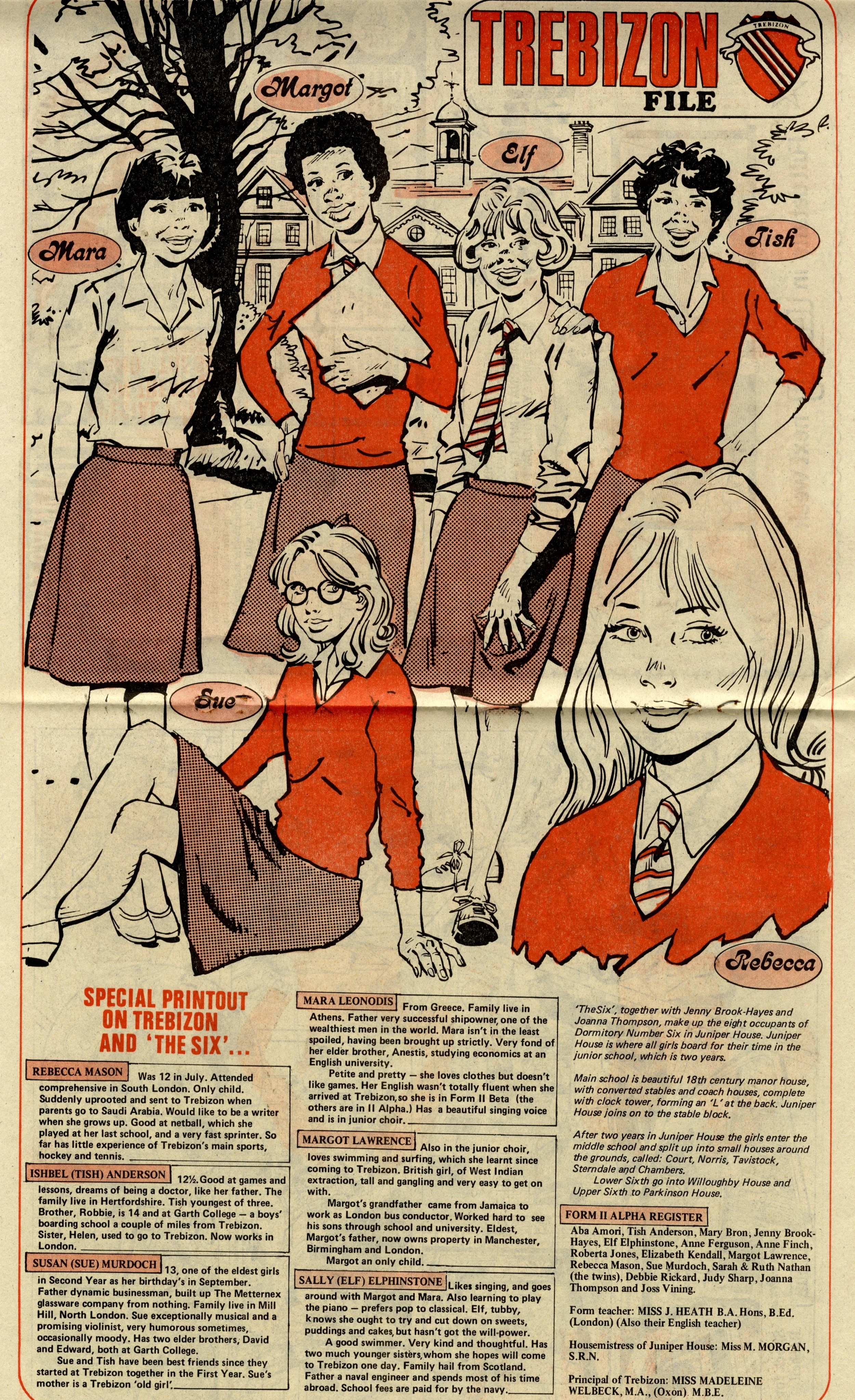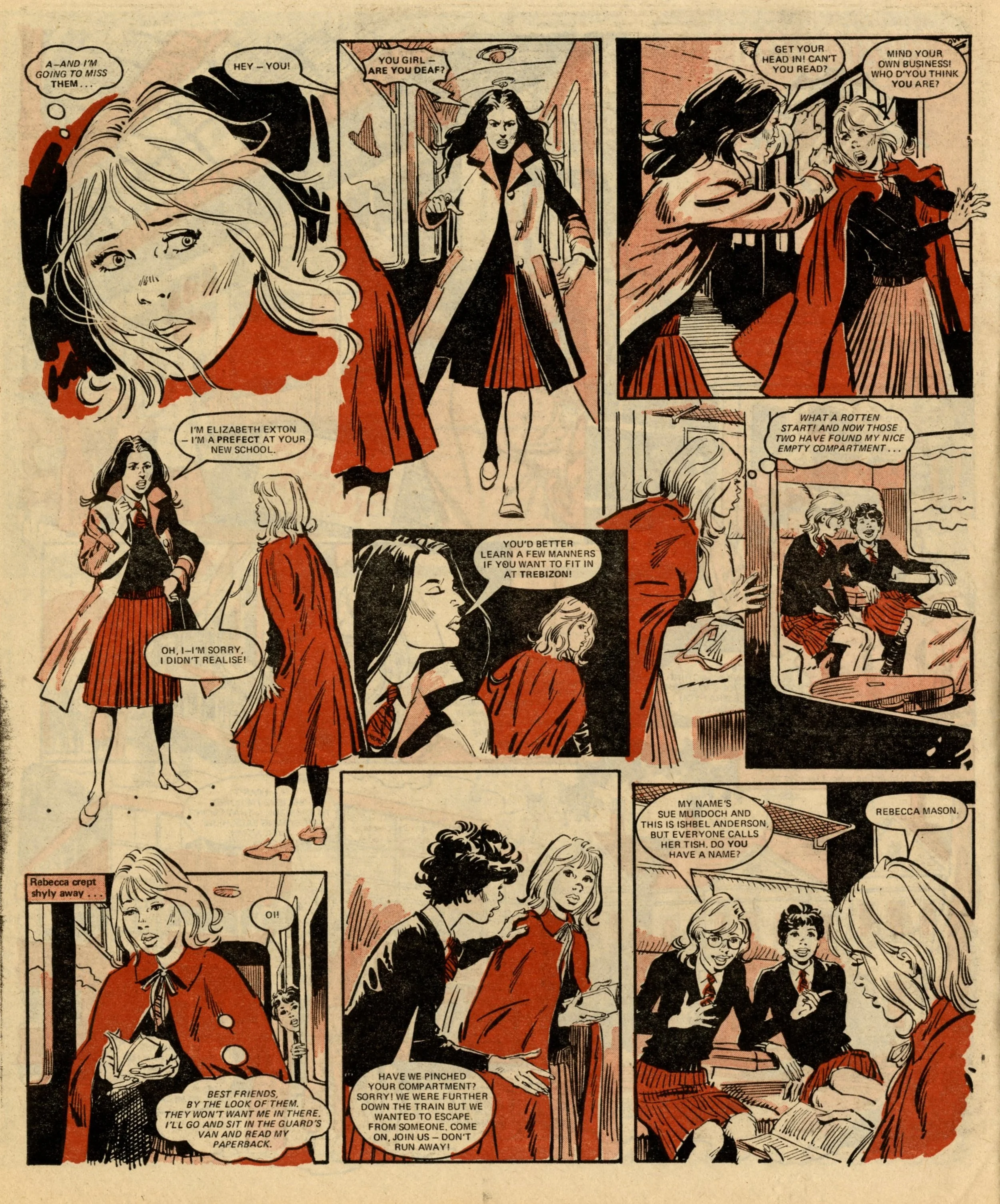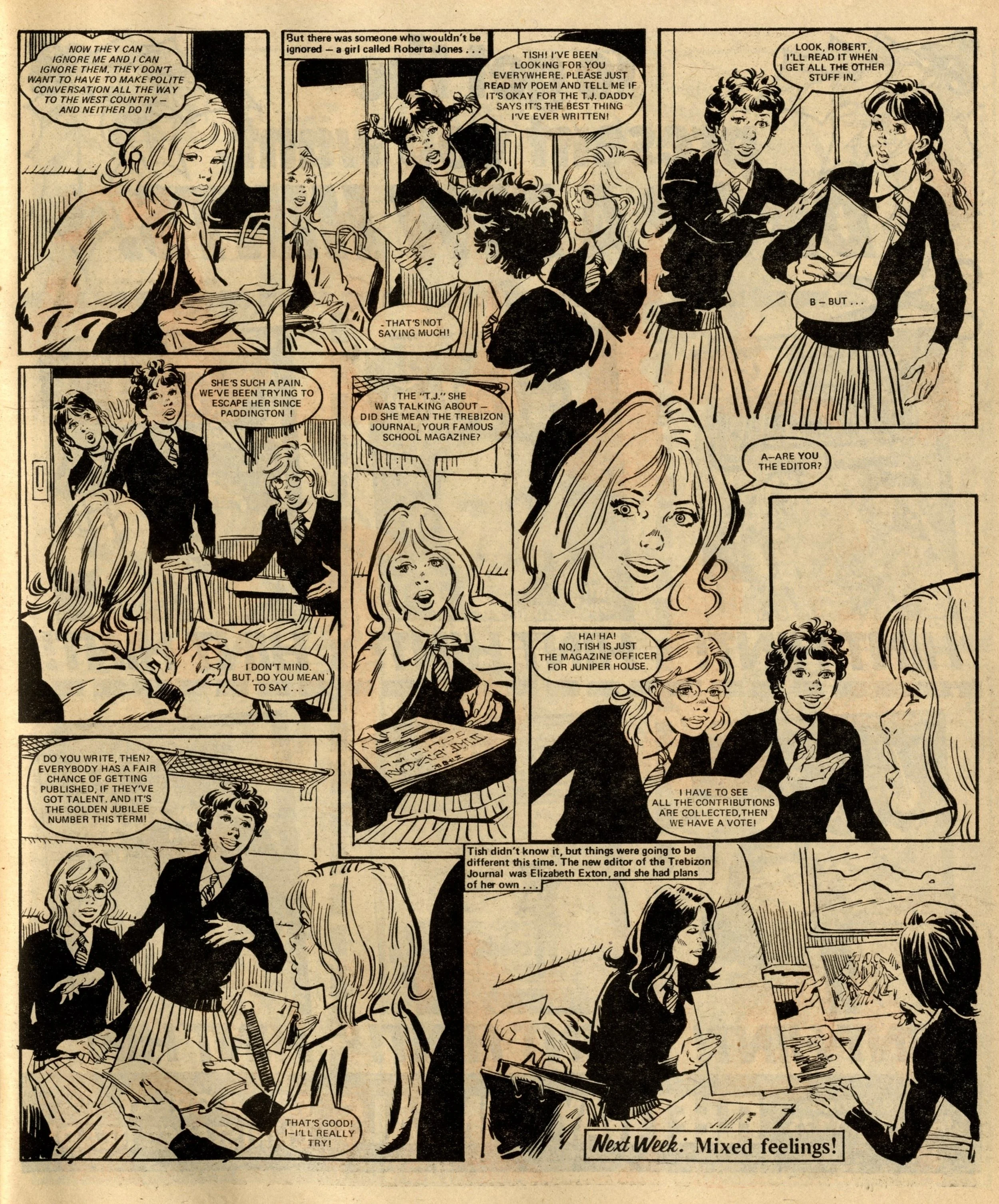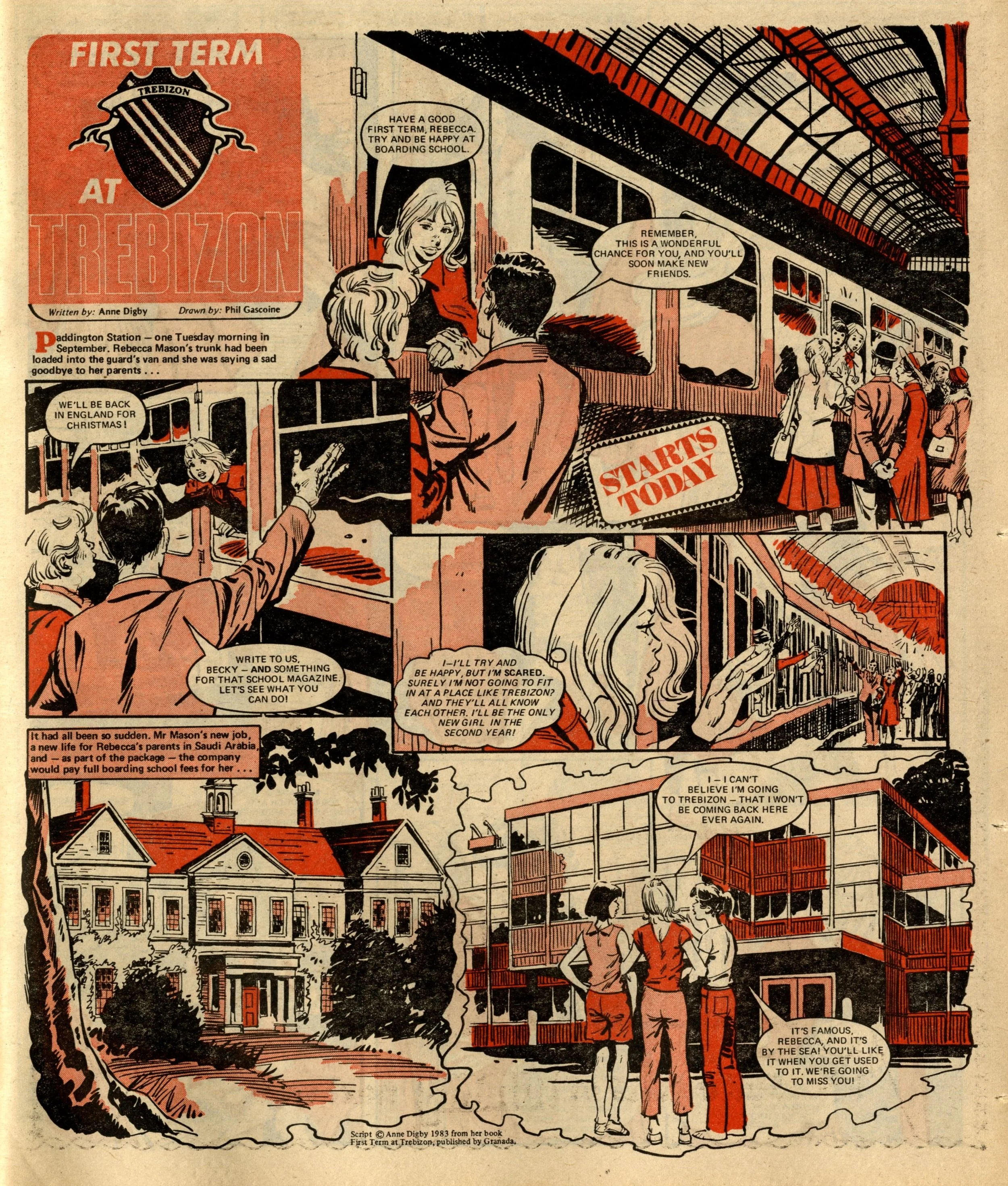 This issue of Tammy, 39 years old this week, boasted the first episode of a serialisation of the first of Anne Digby’s Trebizon novels, based in a girl’s boarding school. Digby adapted the text for the comic herself, and it was illustrated by Phil Gascoine.