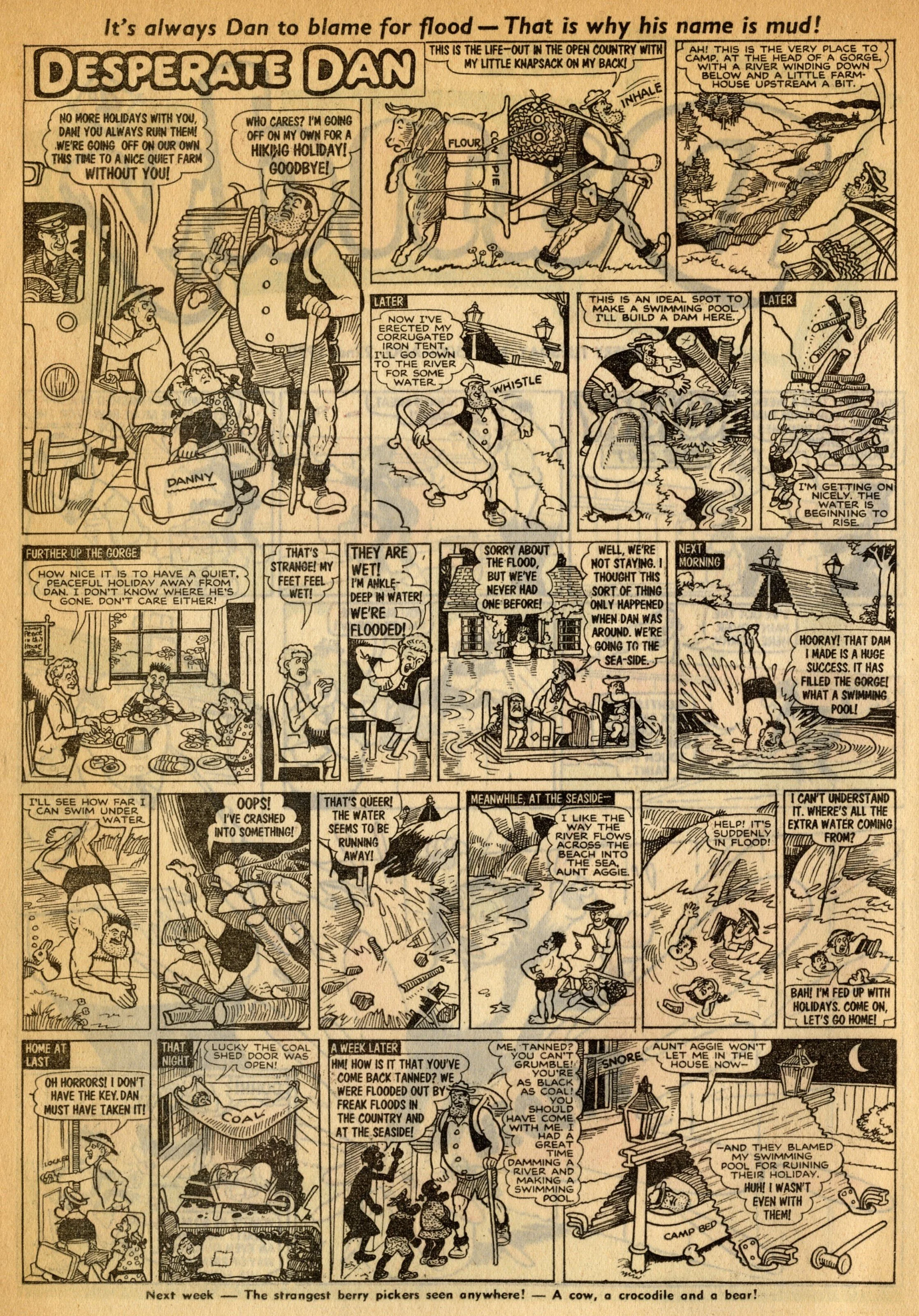 Desperate Dan is as closely associated with the Dandy title as Korky – perhaps more so for some – although he wouldn’t replace the cat on the front cover until 1984. In 1970 the comic was running reprints of earlier Dudley Watkins strips such as this one on page 2 (Dan’s creator died 12 months previously).