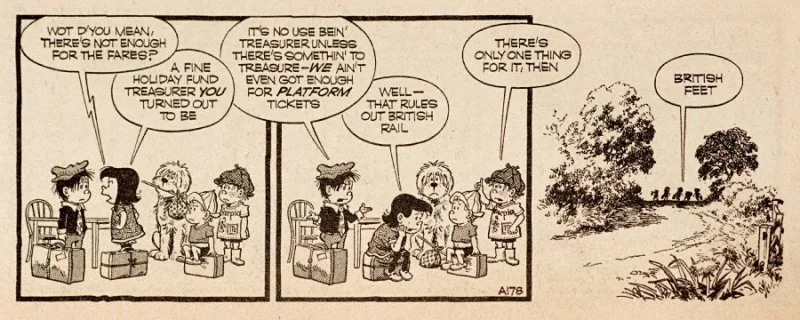 The pace, tone and imagery (that lovely silhouette under the tree) brought to mind those old Maurice Dodd/Dennis Collins Perishers cartoons, Wellington, Maisie and Marlon philosophisin’ an’ foolin’ around against the backdrop of an adult-free rural British landscape.