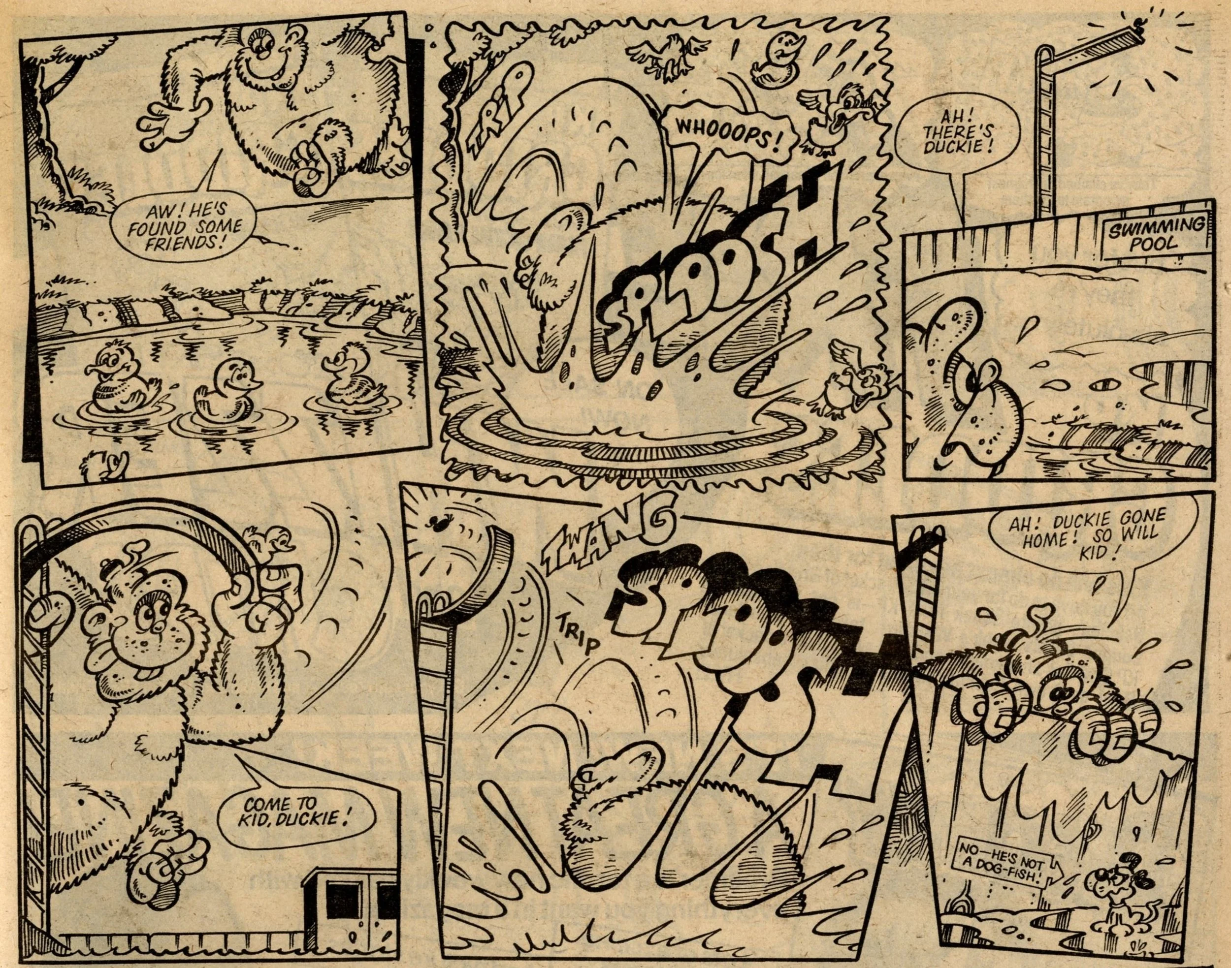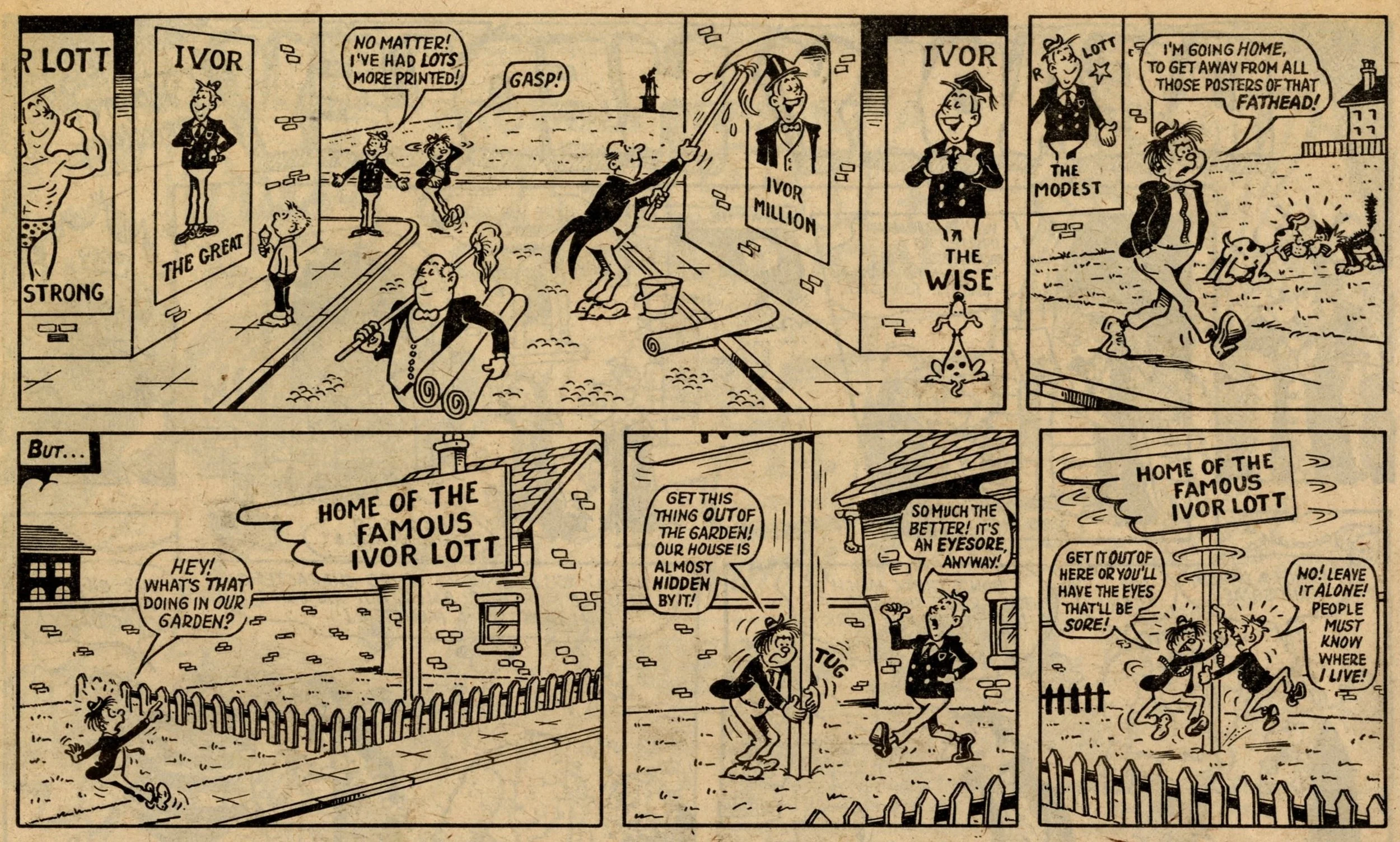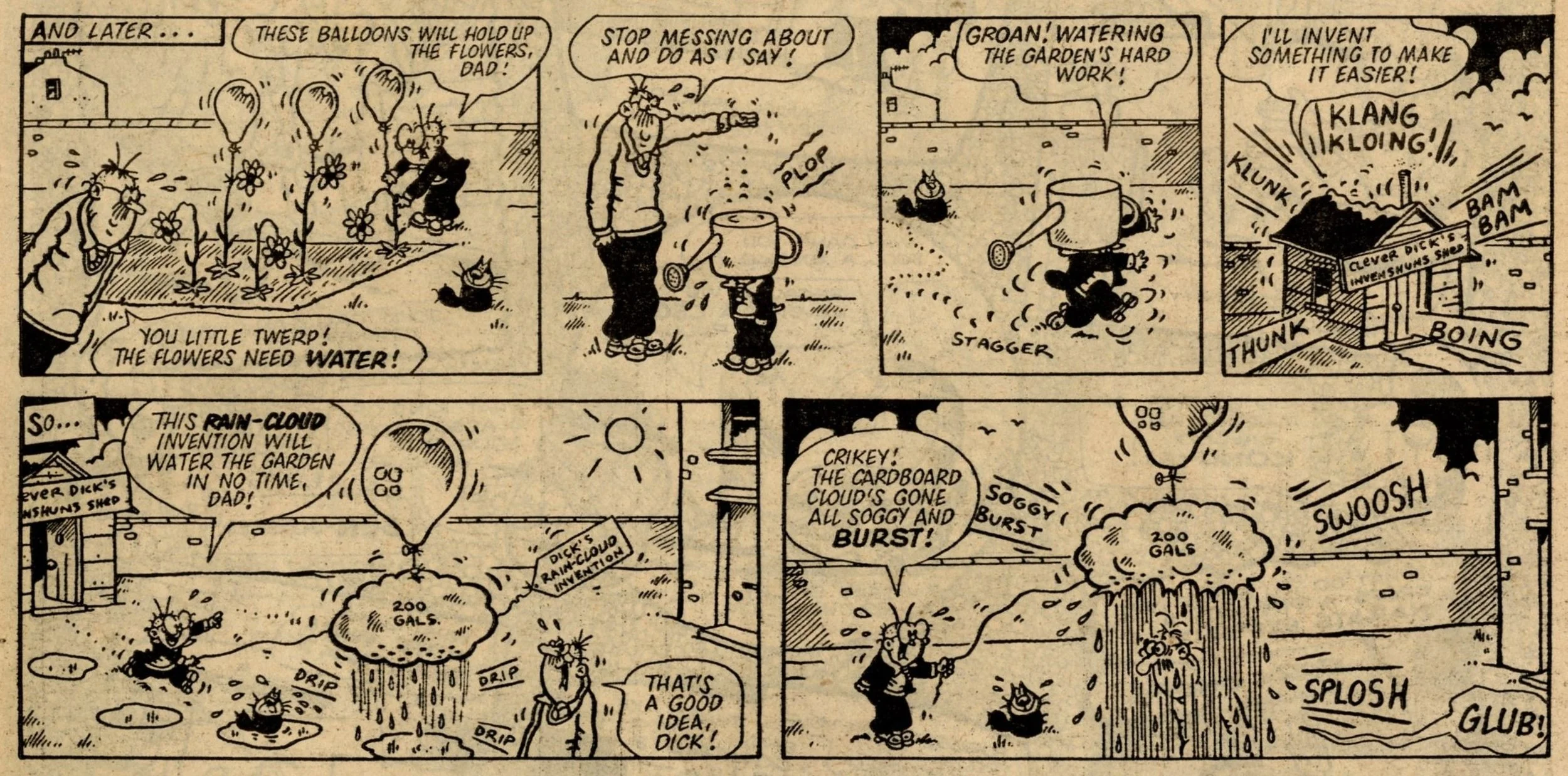 And then there’s the humour: so cheeky and naughty and dark and violent and slapstick. Formulaic, yes, maybe, but within the standard structure that each self-contained, page-length storyline follows, the writers and artists always appear to have had so much fun and taken so much pleasure in their creations. Look at Buster tripping over and giving his rival a mush full of melon at the fruit and veg competition; look at Ivor Lott stamping his smarmy visage across every corner of Tony Broke’s world, like some narcissistic leader of state; look at Gums: Kerboom!; look at the hideous nightmare that is Faceache; look at the wibbly-wobbly Heath Robinson ingenuity of Clever Dick; look at the warped parental psychodrama that is Mummy’s Boy. The parents and moral guardians of our childhood spent a lot of time fussing about Action and Doctor Who and Grange Hill and all that ghastly punk rock business, but one can’t help thinking that a lot more of the really good stuff getting through under the radar within the pages of Buster, Whoopee! and the gang.