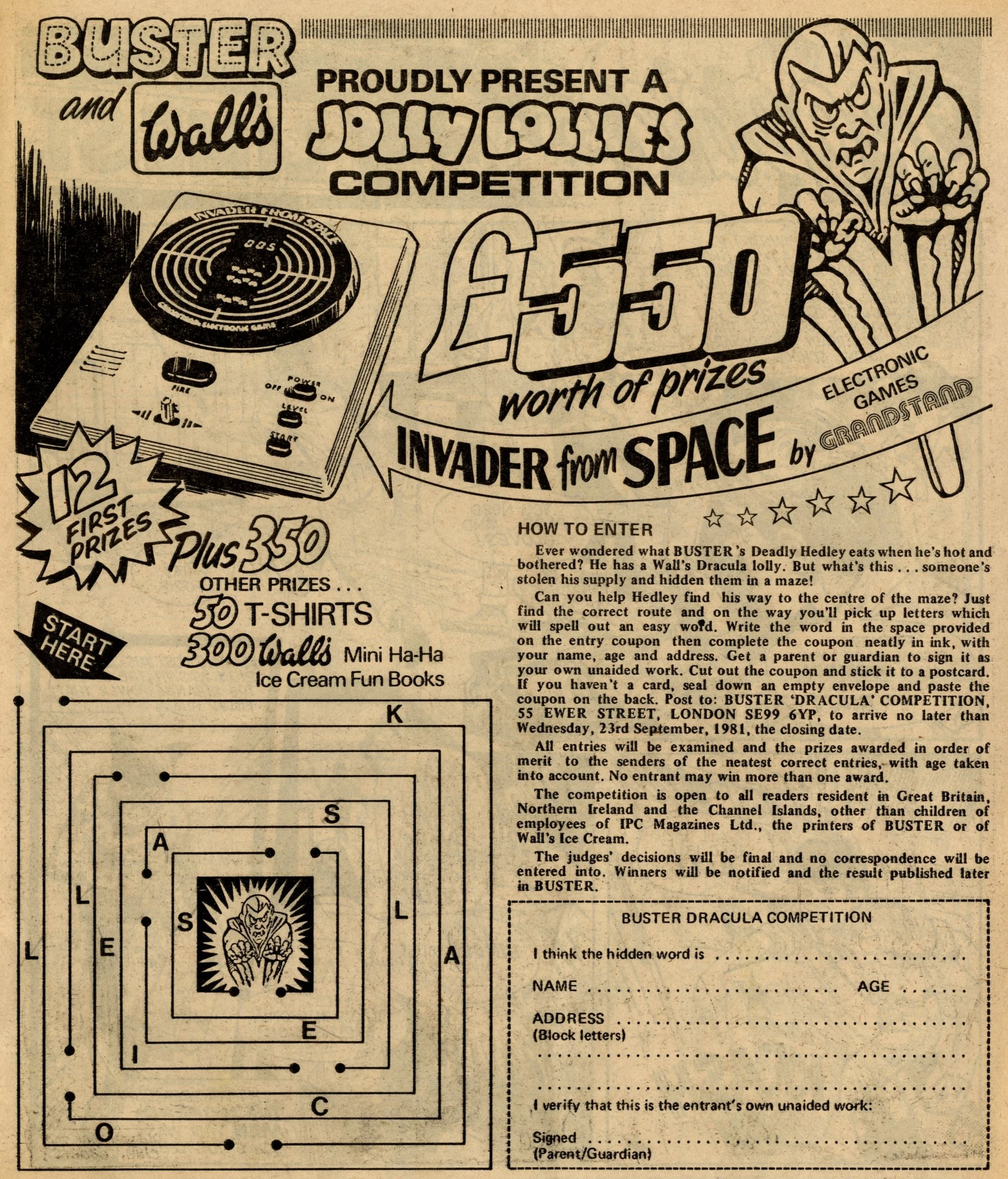 On this day, 12 September 1981 … Cor, look at that Dracula lolly! They don’t make them like that any more. Or do they? I just looked it up and and it looks as though the Dracula has made a comeback, but no, they don’t make them like that – just as another oblong lolly. We need the real thing. I’d buy it, for sure.